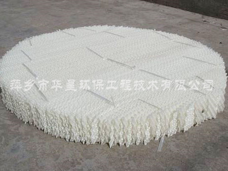 塑料規(guī)整填料具有重量輕,通量大、壓降低、比表面積高、易更換等優(yōu)點(diǎn)。絲網(wǎng)波紋填料由聚丙烯與聚丙烯腈線混合編織網(wǎng)組成。波紋填料可采用聚丙烯PVDF板,為提高傳質(zhì)效率,板上可開孔。塑料規(guī)整填料有:板波紋填料、孔板波紋填料、絲網(wǎng)波紋填料和斜波紋填料等。